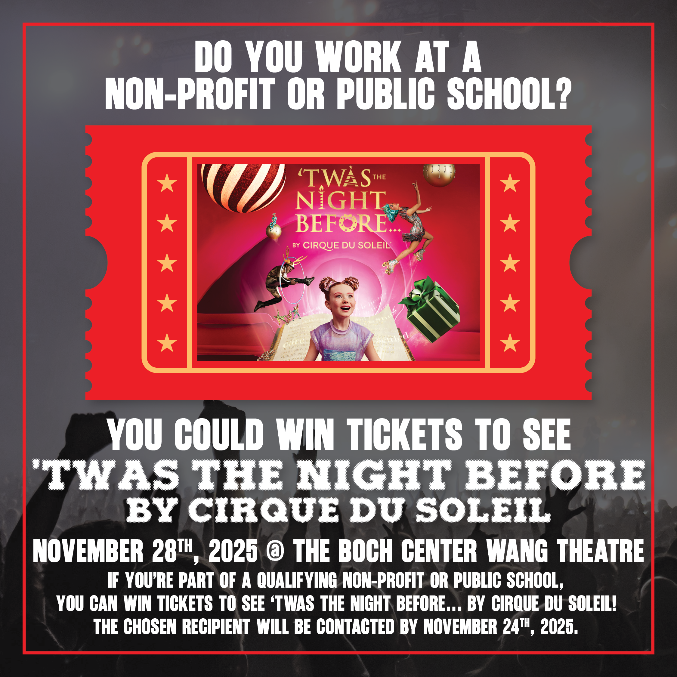 We have 4 exclusive tickets to ‘Twas The Night Before… By Cirque Du Soleil on November 28, 2025, at Boch Center Wang Theatre in Boston, MA.